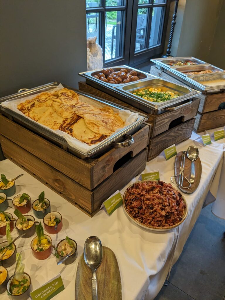 Kom samen met jouw gezelschap genieten van een heerlijk buffet in Kaamps stijl! Standaard: • Stokbrood met sausjes • Friet en gebakken aardappeltjes De koale kant: • Rundvleessalade • Tonijn salade • Kaamps pasta salade • Rauwkost De woarme kant: • Schnitzeltjes • Warme beenham met honing-mosterdsaus • Gehaktballetjes • Varkensoester met champignonsaus of stroganoffsaus • Kipdij met satésaus of stroganoffsaus