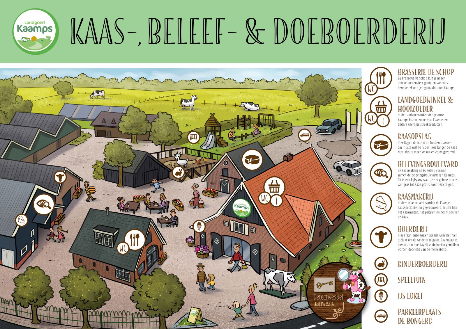 Landgoed Kaamps ligt in het kleine dorpje Deurningen midden in Twente. Omgeven door een prachtige natuur valt er op het landgoed veel te beleven. Zo worden er dagelijks rondleidingen gegeven, kun je zelf kaas maken, op de foto met de koeien of neem jij liever een paar zelf geschilderde klompen mee naar huis?