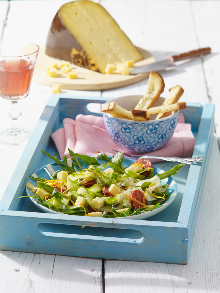 Snijd het wit brood in lange repen en maak in een vijzel een kruidenolie van verse rozemarijn, knoflook en olijfolie. Doop vervolgens het brood in de kruidenolie. Droog het brood in een oven van 160 graden in ongeveer 12 minuten. Schil de asperges en snijd deze met een dunschiller in flinterdunne plakjes, marineer ze met peper, zout en een beetje olijfolie. Boen de sinaasappel schoon en droog deze. Gebruik een zesteur of dunschiller om van de schil dunne sliertjes te trekken. Snijd de chorizo in dunne plakjes en meng deze samen met de Boer´n Trots Koe en de sinaasappelsliertjes door de salade. Neem een groot bord, leg daar de rucola op, daarop de toast en aspergecarpaccio. Strooi er wat sinaasappelsliertjes over ter garnering en als laatste een scheutje olijfolie.
