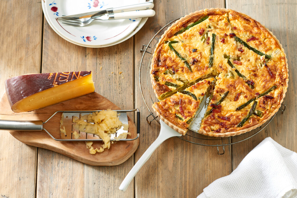 Verdeel de spekjes, ui, knoflook, de kaas en de asperges over de bodem en schenk de vulling in de quichevorm. Zet eerst de quichevorm in de oven en schenk dan de vulling erin. Zo voorkom je dat de vulling uit de vorm loopt bij het verplaatsen van de quiche naar de oven. Bak de quiche ca. 40 min. in het midden van de oven.