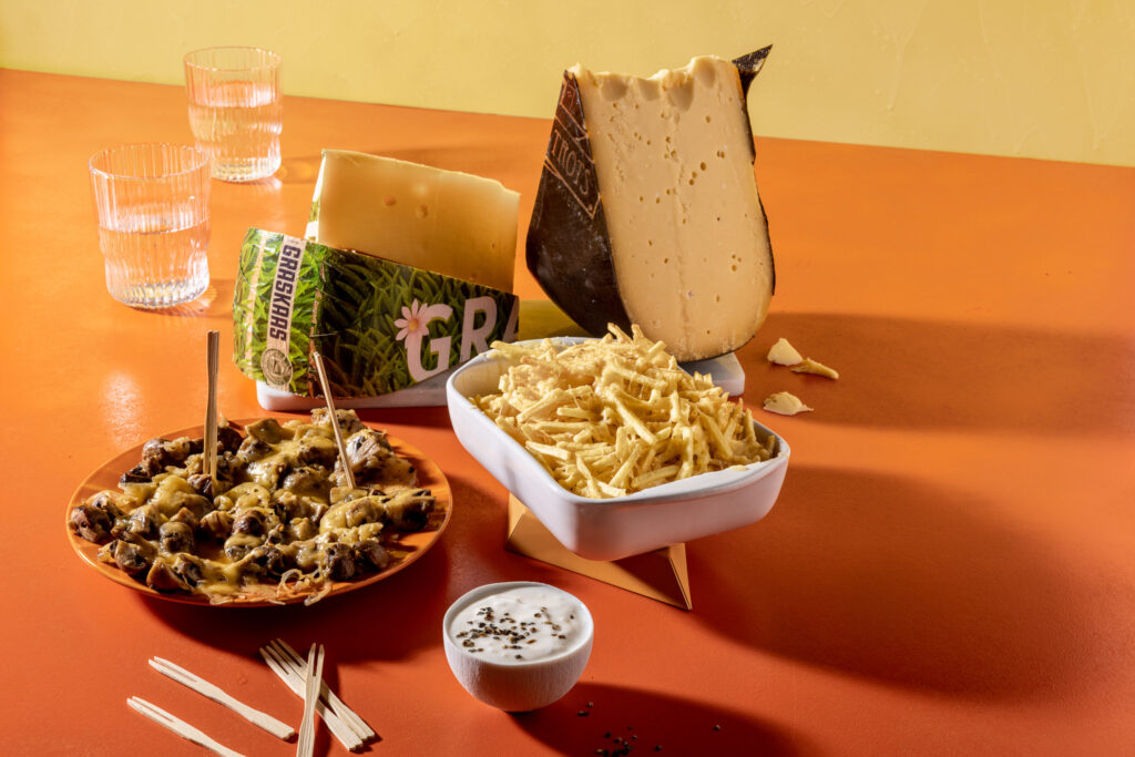 Maak eerst de knoflookdip door de knoflook boven de yoghurt te persen. Roer goed door en breng op smaak met peper en zout. Doe de naturel frietjes in een ovenschaal en bestrooi deze ruim met de Karamel koe.