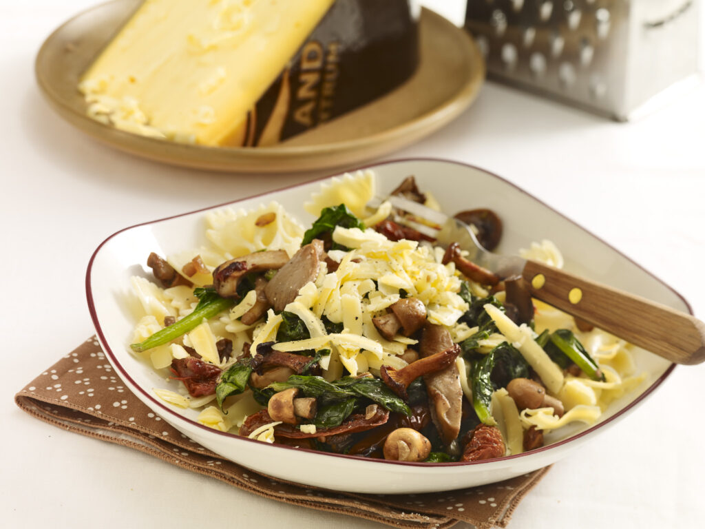 Kook de farfalle pasta volgens de gebruiksaanwijzing. Maak de paddenstoelen schoon en snijd ze in plakjes. Snijd de ui in kleine snippers en pel de knoflook. Snijd de gedroogde tomaatjes in reepjes en rasp de kaas. Verwarm 3 el olijfolie in een wok en fruit de ui en knoflook gedurende 2 minuten. Voeg de paddenstoelen toe en bak deze al omscheppend in 4 minuten. Voeg de tomaat en spinazie toe en laat het, al omscheppend, slinken in ca. 2 minuten. Bestrooi met peper en zout naar smaak. Sprenkel de rest van de olie door de afgegoten farfalle. Verdeel de farfalle over 4 borden, schep hierover het paddenstoelenmengsel en strooi als laatste de kaas over de farfalle.