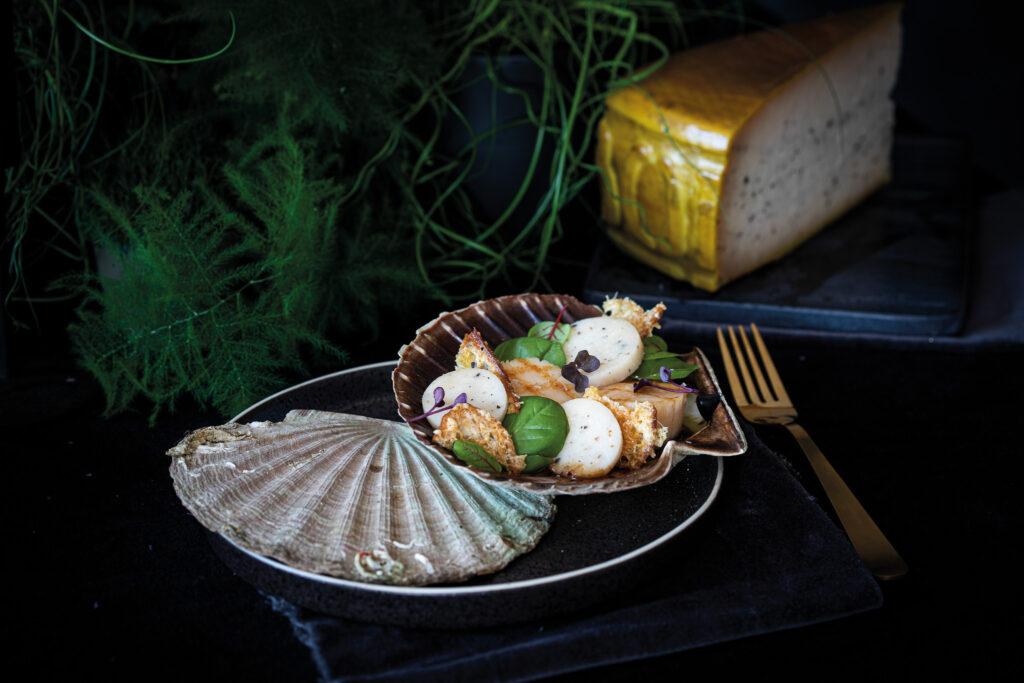 Serveer de coquille in de schelp met kaas er tegenaan, het spruitenblad er bovenop en doe als laatste de dressing erover heen. Klein beetje zout er nog op en genieten maar!