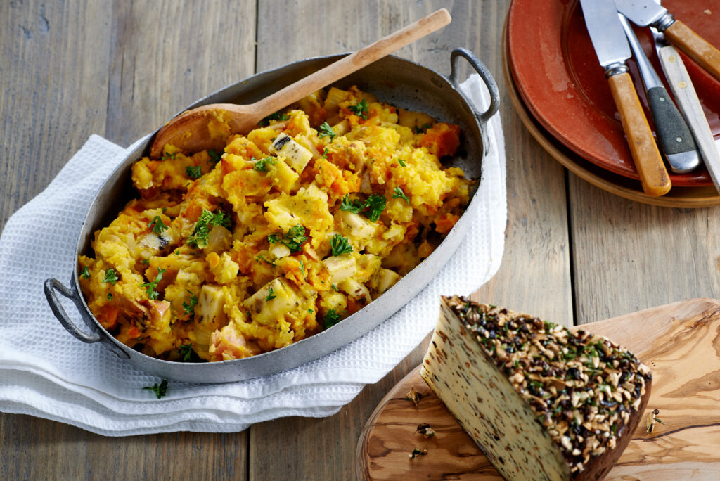 Verwarm de oven voor op 200 °C. Snijd de pompoen, de ui en de appel in stukjes en meng deze in een kom met zout, peper, olie en de komijn. Leg het mengsel op een beklede bakplaat en zet het in de oven voor ca. 20 minuten. Schil de aardappelen en kook ze in ca. 20 minuten gaar. Giet de aardappelen af, kook ze droog en stamp ze fijn. Verwarm ondertussen de melk in een pannetje en voeg deze toe aan het aardappelkruim. Snijd de kaas in blokjes. Voeg vervolgens het pompoenmengsel, de kaas, de kaneel en de peterselie toe aan de aardappelpuree en mix het door elkaar. Breng het geheel op smaak met zout en peper.