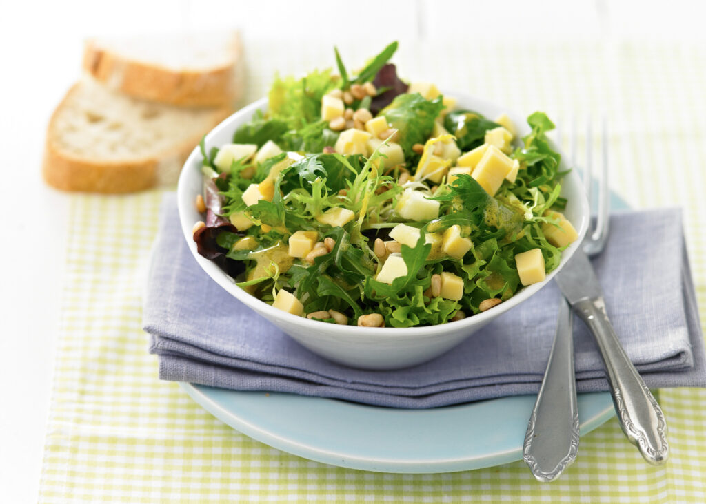 Pers de knoflook. Klop een sausje van azijn, mosterd, olie, knoflook en suiker. Voeg naar smaak zout en peper toe. Rooster de pijnboompitten in een droge koekenpan. Snijd de kaas in kleine blokjes. Was de sla en droog het. Schil de appels en snijd deze in kleine blokjes en besprenkel met citroensap. Schep het sausje door de sla en meng de stukjes kaas en appel er door. Bestrooi met de geroosterde pijnboompitten.