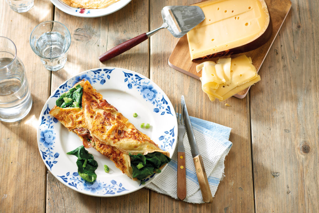 Start ondertussen met het maken van de pannenkoeken. Iedere pannenkoek begin je met het bakken van 1 of twee plakjes rauwe ham. Giet hierover het beslag en leg daarop 1 of 2 plakjes kaas en daarover weer een klein beetje beslag. Let op dat je niet te veel beslag gebruikt, dan wordt de pannenkoek erg dik. Bak de pannenkoek aan twee kanten bruin. Bak zo 8 pannenkoeken. Zet een pannetje met een laagje water op het vuur, zet hier een bord op, zo houdt je de pannenkoeken die al klaar zijn warm. Verdeel vervolgens de spinaziemix over de pannenkoeken en rol de pannenkoeken op. Eet smakelijk! Tip: heb je nog wat pannenkoekenmix over? Bak een aantal pannenkoeken en serveer deze als toetje met wat vanille ijs en kersen.