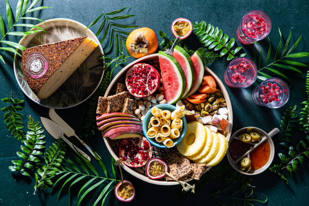 Super makkelijk en toch een feest op tafel! Deze tropische kaasplank maak je in een handomdraai. Snijd plakken kaas met een kaasschaaf, rol de plakjes op en zet deze rechtop in een beker of bakje in het midden van een grote schaal of op een plank. Snijd de watermeloen en mango in slices en de ananas in ringen. Het snijden van een hele ananas kan nogal wat werk zijn. Deze kun je natuurlijk ook in blik kopen.