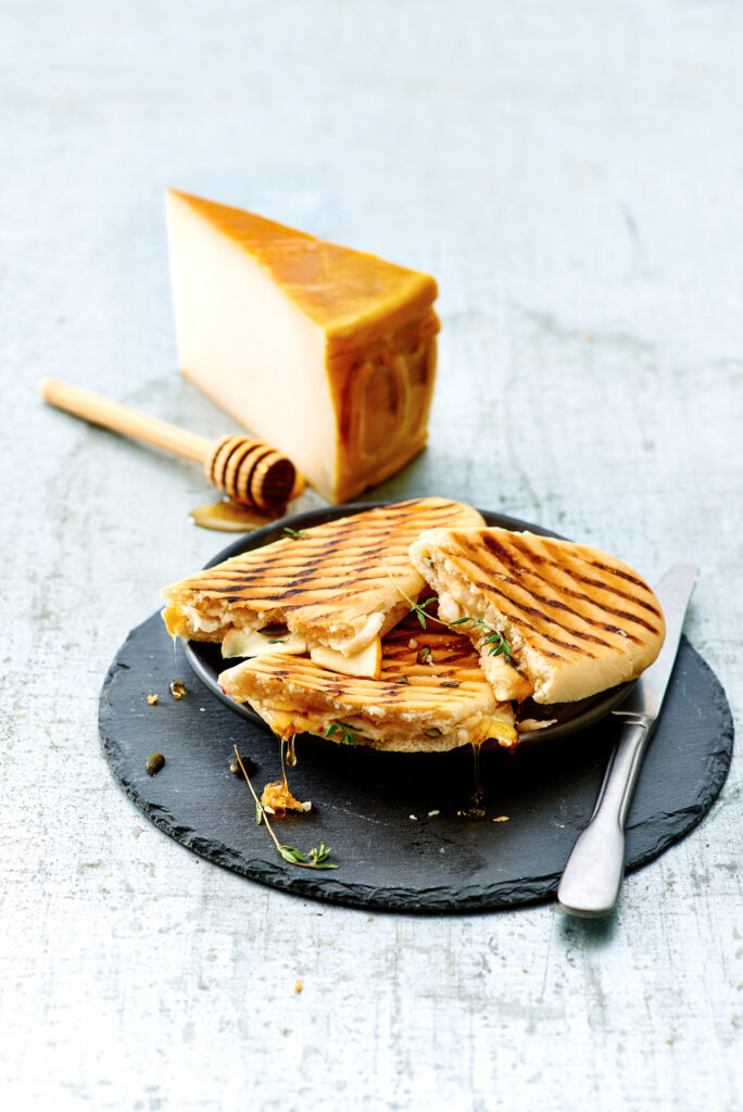 Doe de panini dicht en bak hem in het grill-ijzer (of tosti-ijzer) totdat de kaas is gesmolten. Gebruik je een tosti-ijzer? Doe deze dan niet helemaal dicht, maar laat half open staan.